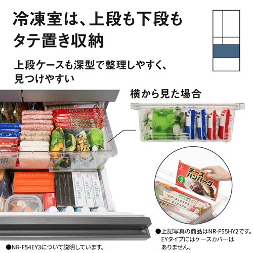 省スペース設置可能で大容量。従来機種と比べて、設置寸法はそのままに、容量が約40Lアップ(※2024年商品 NR-F50EX1との比較。NR-F54EY3:幅650mm×奥行699mm、定格内容積542L、2024年商品NR-F50EX1:幅650mm×奥行699mm、定格内容積501L。※)。