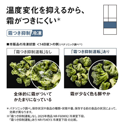 ●冷凍室の食品に霜がつきにくい(★当社調べ。保存状況や食品の種類・状態や量、保存する前の食品の状況によって、効果が異なります。★)(※実験条件:牛ステーキ肉(もも肉)150gをプラスチックパックに入れ、14日間保存。外気温25度、扉開閉なし(当社測定)。●霜つき抑制 運転制御 非搭載 2025年商品 NR-F60WX2 冷凍室下段、霜つき抑制 運転制御 搭載 新製品 NR-F54EY3 冷凍室 下段で保存の比較。※)「霜つき抑制冷凍」