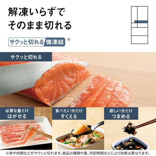 冷凍室:・奥まで見えるフルオープン(ベアリング式高耐荷重レール) ・霜つき抑制冷凍(運転制御) ・冷凍室の性能:冷凍負荷温度(食品温度)-18度以下、冷凍食品保存期間の目安約3ヶ月