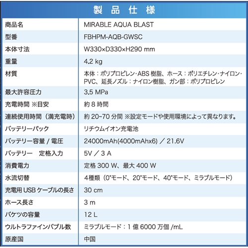 サイエンス ポータブル高圧洗浄機 ミラブル アクアブラスト T-PROFESSIONAL × SCIENCE ウルトラファインバブル FBHPM-AQB-GWSC
