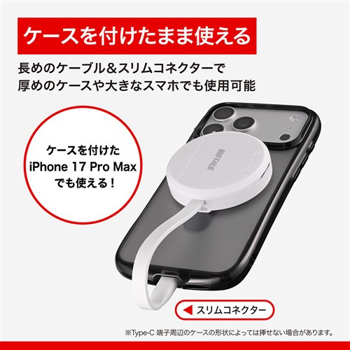 コネクタ部分に厚みのあるケースを装着中でも問題なく使用できます。※ケースのType-C端子周辺の形状によっては、挿し込みができなかったり、負荷がかかることがあります。形状をお確かめのうえ、ご使用ください。※MagSafe対応ケースでご使用になれます。