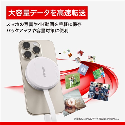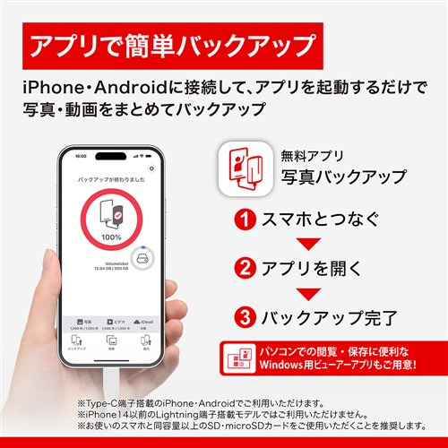 本商品は、バッファローアプリ「写真バックアップ」(無料)に対応。大切な思い出をもっと簡単に保存できます。スマホのUSB-C端子に接続するだけで、写真やビデオをSD/microSD(いずれも別売)へスムーズにバックアップ。「写真バックアップ」アプリなら、保存したデータの閲覧や復元もかんたんに行えます。※対応機種:USB-C端子搭載のiPhone/iPad/Android端末