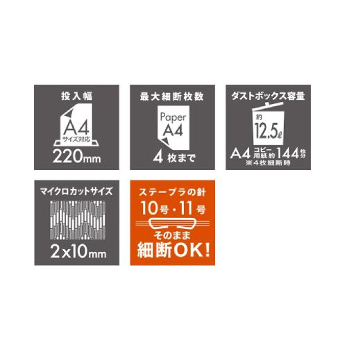 ダストボックス容量:約12.5リットル : A4コピー用紙 約144枚分(4枚細断時)※ダストボックス内で 細断くずを均等にならした場合の理論値です。