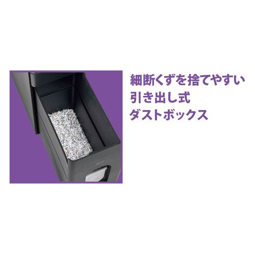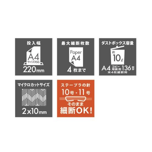 ダストボックス容量:約10リットル : A4コピー用紙 約136枚分(4枚細断時)※ダストボックス内で 細断くずを均等にならした場合の理論値です。