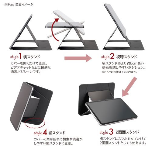 style(1)横スタンド カバーを開くだけで変形。ビデオチャットなどに最適な通常ポジションです。style(2)視聴スタンド 横スタンド時より約6cm高い動画視聴しやすいポジション。※カメラの位置は下になります。style(3)2画面スタンド 横スタンドにスマホを立てかけて2画面スタンドとしても使えます。style(4)縦スタンド カバーの角が折れて検索や読書がしやすい縦スタンドに変形。