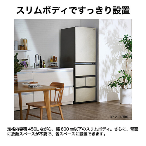 定格内容積450Lながら、幅600mm以下のスリムボディ。さらに、背面に放熱スペースが不要で、省スペースに設置できます。