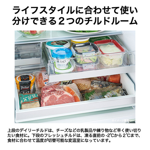 上段のデイリーチルドは、チーズなどの乳製品や練り物など早く使い切りたい食材に。下段のフレッシュチルドは、凍る直前の-2度から2度まで、食材に合わせて温度が切替可能な変温室になっています。