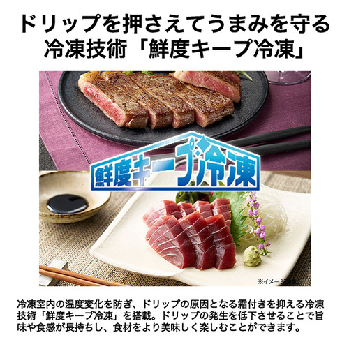 冷凍室内の温度変化を防ぎ、ドリップの原因となる霜付きを抑える冷凍技術「鮮度キープ冷凍」を搭載。ドリップの発生を低下させることで旨味や食感が長持ちし、食材をより美味しく楽しむことができます