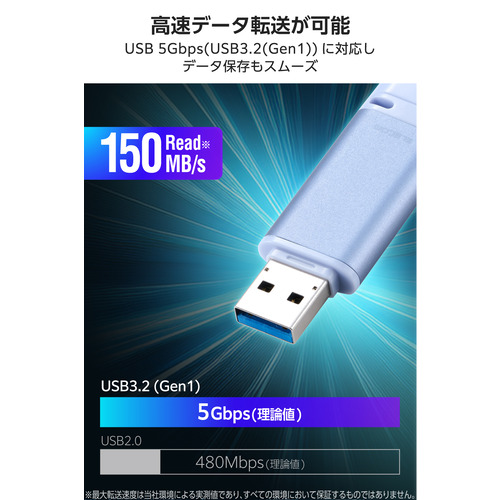 ●USB 5Gbps(USB3.2(Gen1))対応で、読み込み時の最大データ転送速度150MB/sを実現しています。大容量データ、大量のデータでも高速データ転送でストレスなく使用できます。