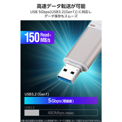 ●USB 5Gbps(USB3.2(Gen1))対応で、読み込み時の最大データ転送速度150MB/sを実現しています。大容量データ、大量のデータでも高速データ転送でストレスなく使用できます。