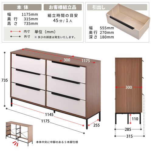 耐荷重:天板:約15kg 引出し:約5kg(×6)=全体約45kg