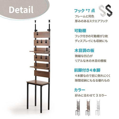 耐荷重:棚板:約15kg / 引っかけ棚:約5kg(1枚につき) / フック:約1kg(1本につき)=全体約32kg