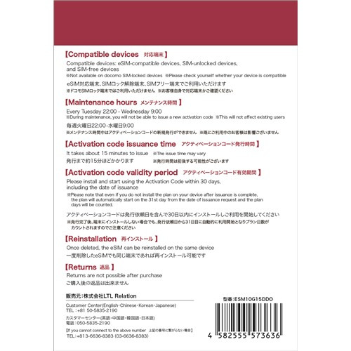 LTL Relation ESM10G15DDO eSIM 10G 15日用 即日利用可能 デザリング対応