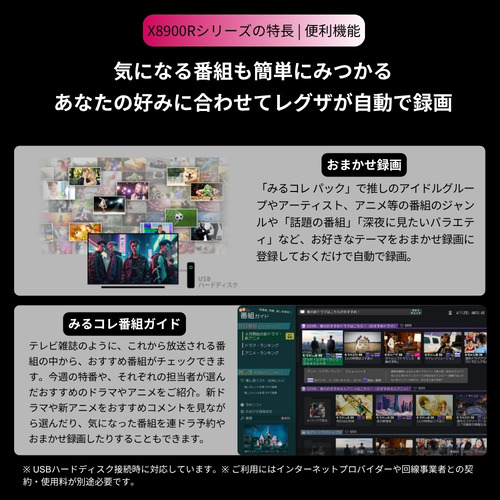 あなたの好きなタレントやジャンルの番組から、ネット動画やシーン、CMまで一覧で見られます。また、おまかせ録画を設定すると予約なしにまるっと自動録画!