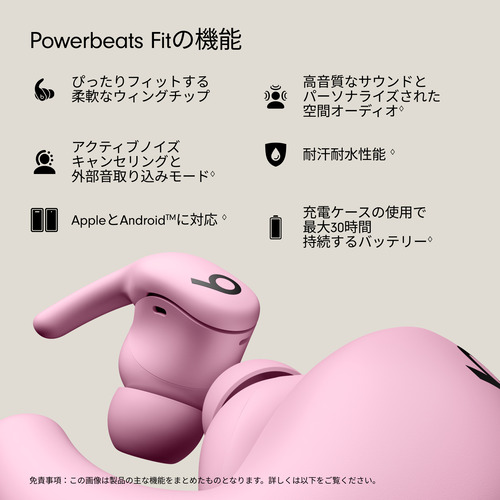 ※2 Powerbeats Fitイヤーバッドには耐汗耐水性能があります。水上または水中でのスポーツやエクササイズには対応しません。Powerbeats Fitイヤーバッドは実験室の管理された条件下でテストされており、IEC規格60529にもとづくIPX4等級に適合しています。耐汗耐水性能は永続的に維持されるものではなく、通常の使用によって耐性が低下する可能性があります。Powerbeats Fitイヤーバッドが濡れている場合は充電しないでください。クリーニングと乾燥の方法については、support.apple.com/ja-jp/101597をご覧ください。