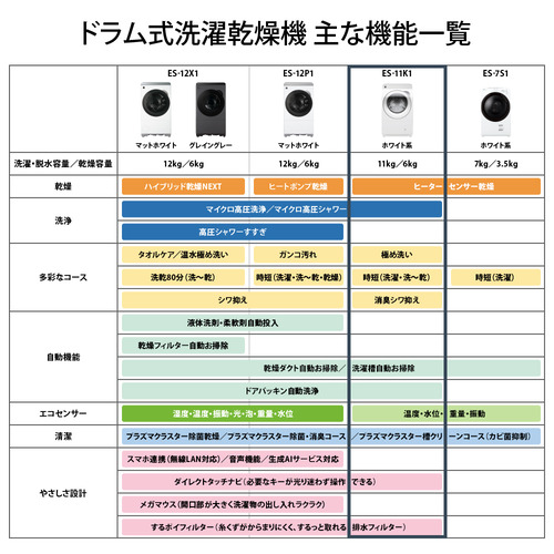 シャープ ドラム式洗濯機 左開き 洗濯11.0kg 乾燥6.0kg 幅64cm 自動お掃除 高圧シャワーすすぎ ES11K1 ホワイト系