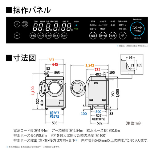 本体注釈:幅は排水ホース、高さは給水ホース含む。
