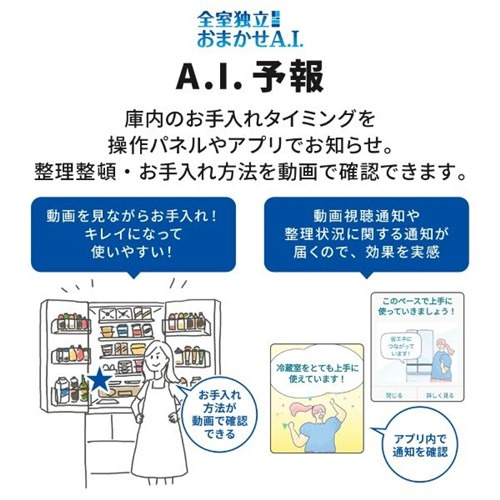 野菜の冷凍をもっと便利にする「できちゃうV冷凍+」に進化!「できちゃうV冷凍」が「さらに時短」と「手間削減」を実現した「できちゃうV冷凍+」に進化。保存スペースが冷凍室全体に拡張したことで、まとめ買いした野菜の保存にも安心。AI化による操作レスで野菜を砕きたい時にいつでも砕くことができ、時短調理ができる。対象野菜が計17種類(従来11種類+新規6種類)、レシピが計39レシピ(従来22レシピ+新規17レシピ)に拡張し、野菜の冷凍がより便利に使いやすく。冷凍なのにサクッと切れて、しかもおいしい「切れちゃう瞬冷凍A.I.」、AIが使用状況を分析し適したタイミングに自動で食品の霜の発生を抑制する「霜ガード」も継続塔載。