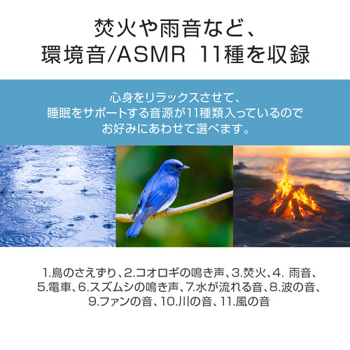 ●焚火や雨音など、環境音/ASMR 11種を収録心身をリラックスさせて、睡眠をサポートする音源が11種類入っているのでお好みにあわせて選べます。