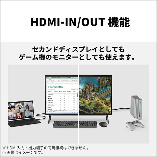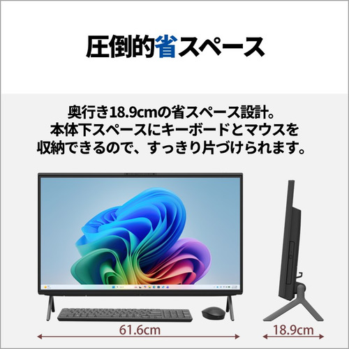 大画面でも幅61.6cm奥行18.9cmと圧倒的省スペースを実現しています。本体下にキーボードとマウスを収納できるので、普段の置き場所にも困りません。