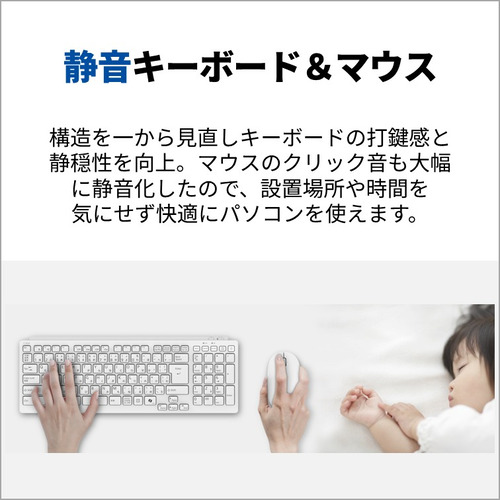 従来に比べ打鍵音・クリック音を大幅に静音化した静音マウス&静音キーボードはWeb会議中の操作も夜中のWeb閲覧も周囲を気にすることなく快適に使えます。