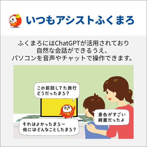 ふくまろにはChatGPTが活用されているので、自然な会話がたくさんできます。YouTube再生などのパソコン操作も会話でかんたんにできます。