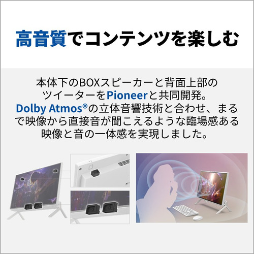 Pioneerと開発した2+2chスピーカーシステムで、高音域から低音域までを豊かに再現。さらにDolby Atmosの空間オーディオ技術により、対応コンテンツを立体音響で楽しめます。