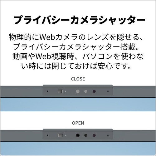 物理的にWebカメラのレンズを隠せる、プライバシーカメラシャッター搭載。動画やWeb視聴時、パソコンを使わない時には閉じておけば安心です。