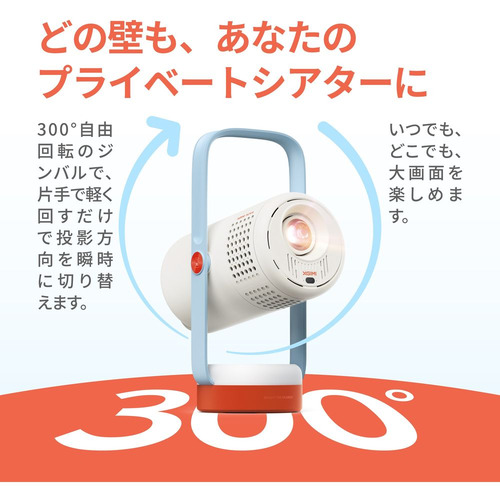 設置場所に縛られず、300°自由回転のジンバルで、片手で軽く回すだけで投影方向を瞬時に切り替えます。いつでも、どこでも、大画面を楽しめます。