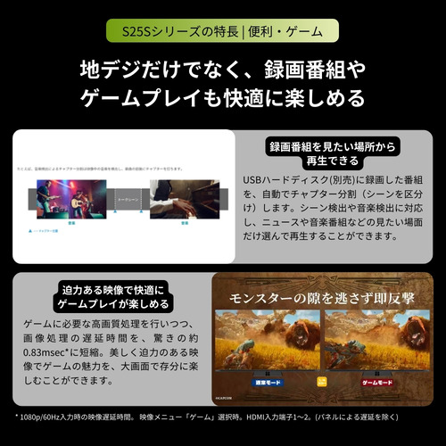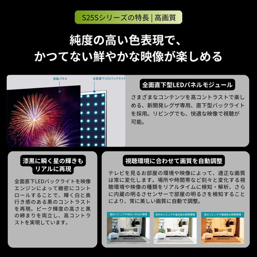 【高画質】:■映像処理エンジン:レグザエンジンHR、■地デジ高画質:地デジビューティ、■自動映像調整機能:おまかせオートピクチャー、■パネル:全面直下型LEDパネルモジュール