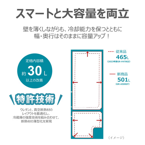 従来の400Lクラスの幅はそのままに、容量プラス90L。コンパクトなのにたっぷり入るから、まとめ買いにも安心です。