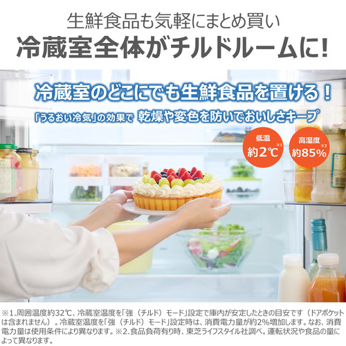 また、「ミストチャージユニット」により、冷風が食材に直接あたることを防ぎながら、湿度をコントロール。水腐れも防ぎながら約10日間新鮮なまま保存可能。