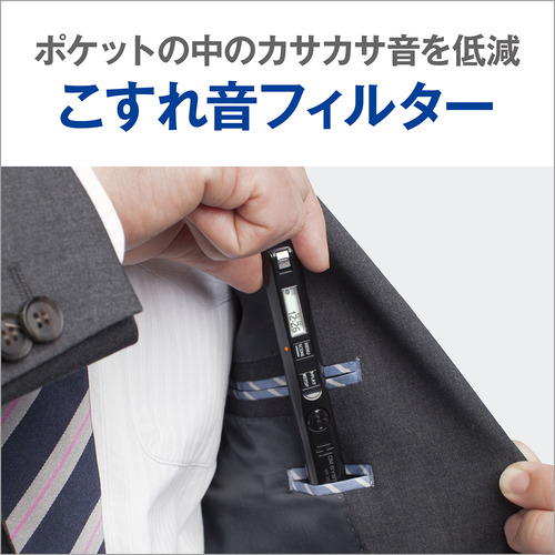 レコーダーをポケットの中に入れて録音すると、レコーダーと衣服が擦れる音が録音されてしまいがちです。そんなときは「擦れ音フィルター」を使えば、左右のマイクから入る音をレコーダーが瞬時に分析し、人の声と擦れ音を識別して、擦れ音を抑えて人の声を聞きやすく記録します。