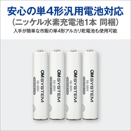 電池: 単4形乾電池1本(LR03)またはOMデジタルソリューションズ製ニッケル水素充電池1本(本体内充電はOMデジタルソリューションズ製BR404 を使用のこと)