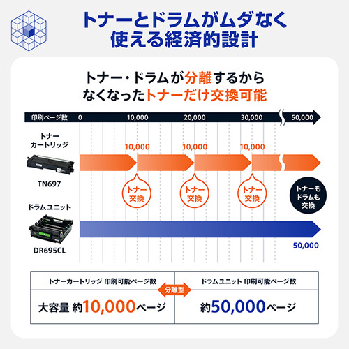 交換トナーは標準容量(TN695シリーズ)と大容量(TN695XLシリーズ)、超大容量トナー(TN697シリーズ)の3種類。超大容量シリーズは、1回の交換でモノクロ/カラーともに約10,000ページの印刷が可能。※ A4文書の場合。
