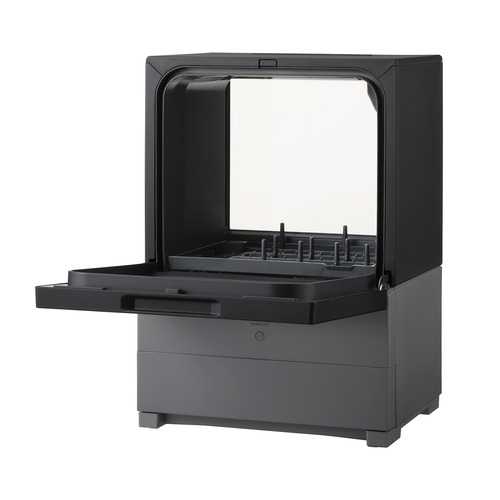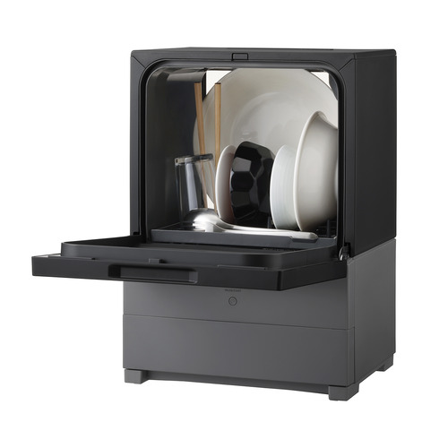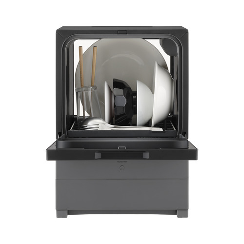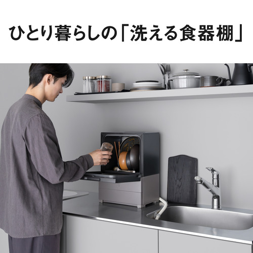 分岐水栓の取り付けなしで、すぐ使用できるタンク式食洗機。デザインと使い勝手にこだわった、着脱可能な給水タンクを搭載。