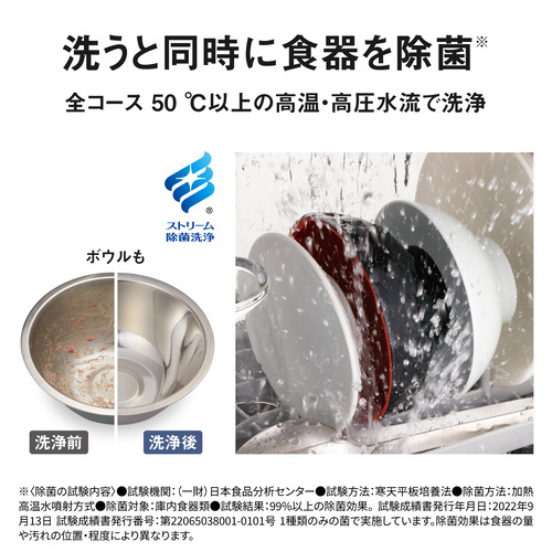 除菌機能:ストリーム除菌洗浄(※<除菌の試験内容>●試験機関:(一財)日本食品分析センター●試験方法:寒天平板培養法 ●除菌の方法:加熱高温水噴射方式 ●除菌の対象:庫内食器類 ●試験結果:菌の減少率99%以上。1種類のみの菌で実施しています。除菌効果は食器の量や位置、汚れの程度により異なります。試験成績書発行年月日:2022年9月13日 試験成績書発行番号:第22065038001-0101号※)