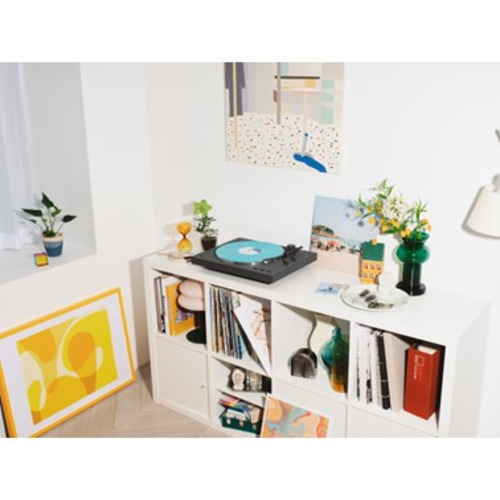 直線と面で構成されたシンプルな造形。音楽と空間を高め、日常に自然に溶け込みます。45回転アダプターは本体側面の収納ホールに格納できます。