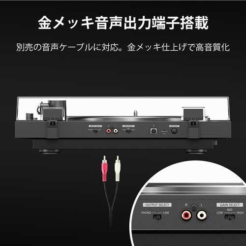 PS-LX5BTは、PS-LX3BTよりも高級なカートリッジとスタイラス(針)を搭載。広域の伸びや空気感、音場の広がりが出て、繊細な音の表現に優れています。より正確なトラッキングを実現するためにヘッドシェル裏面の強化と、レコード面との密着性が高く不要共振が少ない、5mm厚の高音質ラバーマットを採用しています。金メッキを施した音声出力端子を搭載し、付属の音声ケーブルから別売の音声ケーブルと交換して使うことができます。