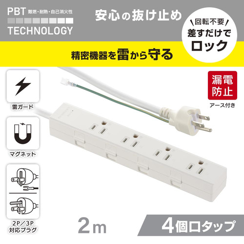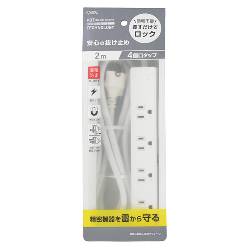 オーム電機 HS-TKML42-3PE25-W 電源タップ 4個口 2m 雷ガード・アース付 ホワイト