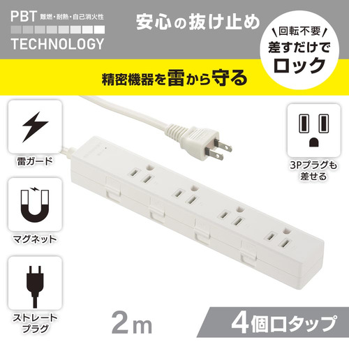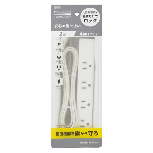 オーム電機 HS-TKML42-3P25-W 電源タップ 4個口 2m 雷ガード付 ホワイト