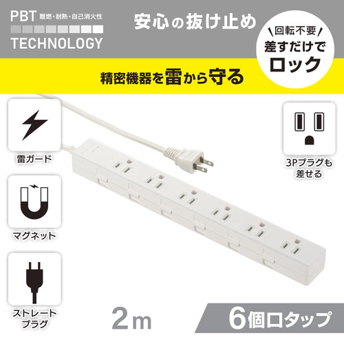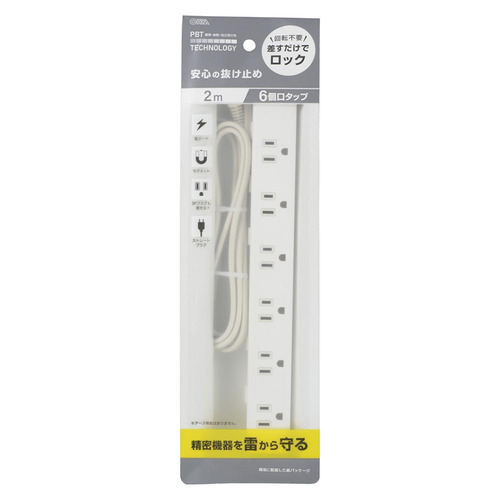 オーム電機 HS-TKML62-3P25-W 電源タップ 6個口 2m 雷ガード付 ホワイト