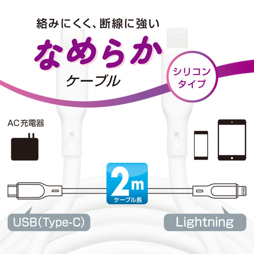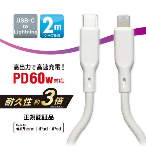 オーム電機 SMT-L20SCL-W なめらかケーブル USB-C to Lightning 2m PD60W対応 ホワイト