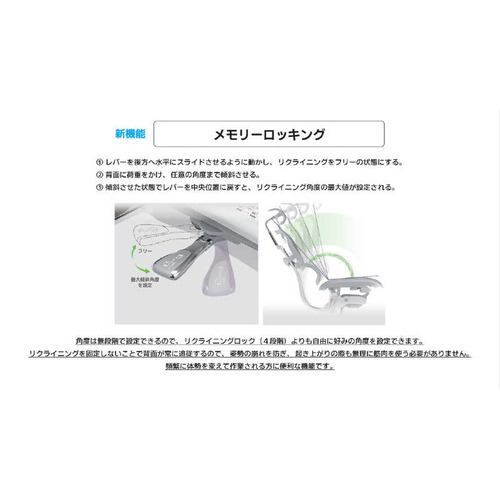 ●独立式ランバーサポートの働きエルゴヒューマンの最大の特徴である”独立式ランバーサポート” 背面との一体型が主流だったランバーサポートを背面から独立させ、腰を独自にサポートするように設計しています。新シリーズではランバーサポート部の角度とテンションは背面から独立して個別に調節できるようになりました。全機種共通機能1、7段階シートスライド機能 2,座面昇降機能 3、4段階リクライニング機能 4、リクライニング硬さ調整機能 5、4Dアームレスト 6、バックレスト高さ調整機能 7、前傾チルト機能 8、ランバーサポートテンション調整機能 9、メモリーロッキング機能新機能「メモリーロッキング」リクライニング時の最大傾斜角度を無段階で調整ができるようになりました。リクライニング時の角度の上限を設定することで、頻繁に体勢を変えて作業される方にオススメな機能です。2色のフレームと23色の新メッシュ生地フレームはブラック(BF)とグレー(GF)の2色から選べます。メッシュ生地はブラック(BK)/グレー(GY)/レッド(RD)/ブルー(BL)/グリーン(GN)の5色から選べます。メッシュ生地/アルミポリッシュフレーム/PUキャスター弾力性に優れたメッシュを採用。多様な座り方に対応し、長時間のデスクワークをサポート。高級感と耐久性のあるアルミポリッシュフレームを標準採用。60mmサイズの双輪PUキャスターを標準搭載。