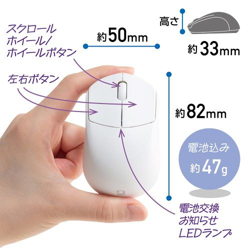 標準サイズのマウスより約4割軽い。軽量ミニマウスと比較しても約3割軽くなっています。※標準サイズのマウスはナカバヤシ社製MUS-RKT172/MUS-BKT174約82gと比較 軽量ミニマウスは同社MUS-RKT109/MUS-BKT111約67gと比較しています。