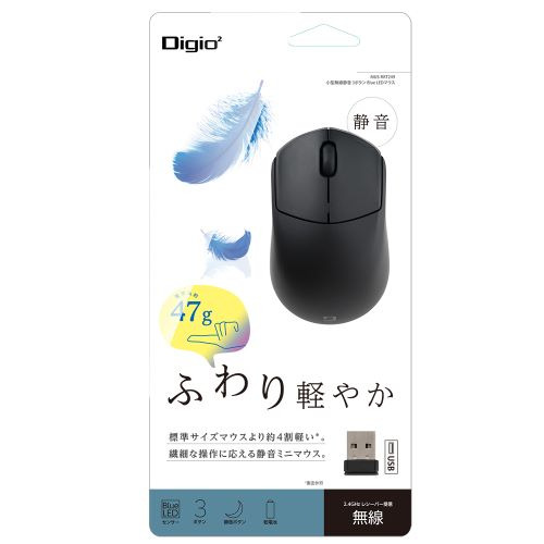 標準サイズのマウスより約4割軽い。軽量ミニマウスと比較しても約3割軽くなっています。※標準サイズのマウスはナカバヤシ社製MUS-RKT172/MUS-BKT174約82gと比較 軽量ミニマウスは同社MUS-RKT109/MUS-BKT111約67gと比較しています。