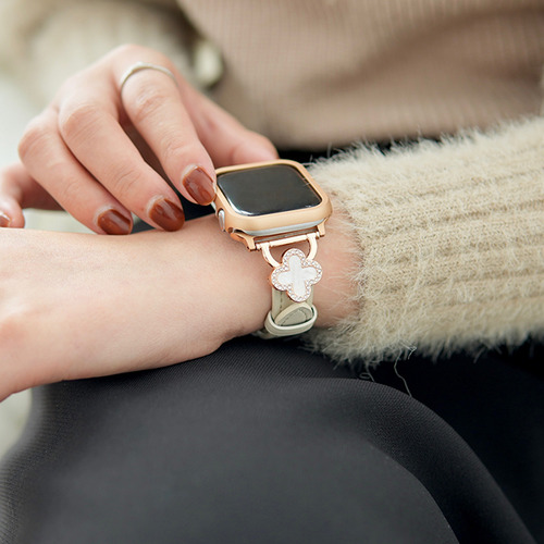 上品なホワイトのクローバーが目を惹くアップルウォッチバンドです。