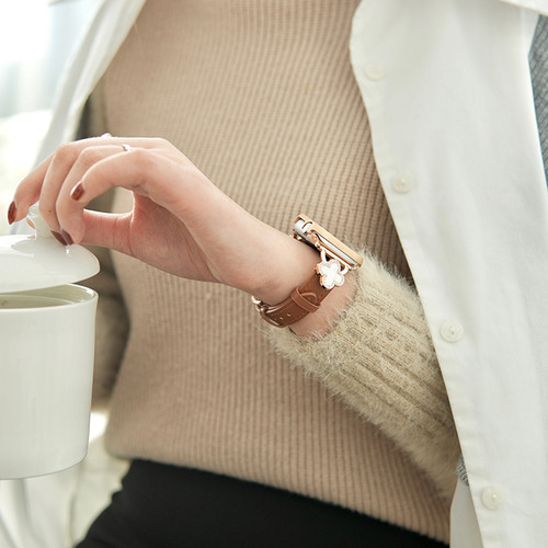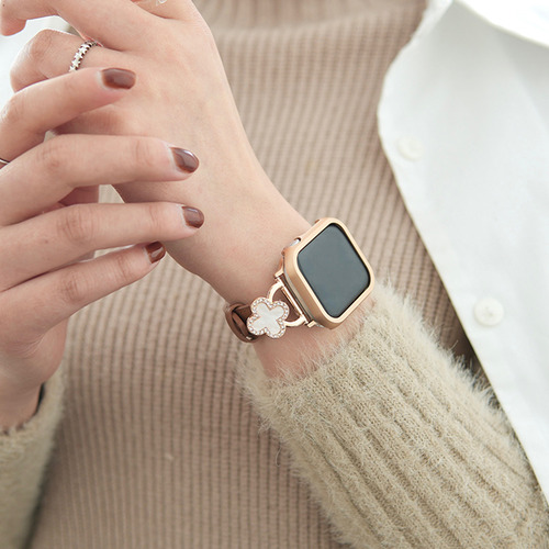 上品なホワイトのクローバーが目を惹くアップルウォッチバンドです。