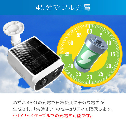 カメラ本体上部のソーラーパネルが太陽光で自動充電し電力を供給します。USB-C充電にも対応しており、日照条件が不利な環境でも安定して運用できます。本体にパネル搭載で別途ソーラーパネルを取り付ける必要ありません。