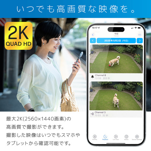 2K(2560×1440)の高解像度で、人物や荷物・車両まで細部をくっきり記録します。ペットの見守りや玄関の荷物確認、駐車場の監視など、さまざまなシーンに対応します。